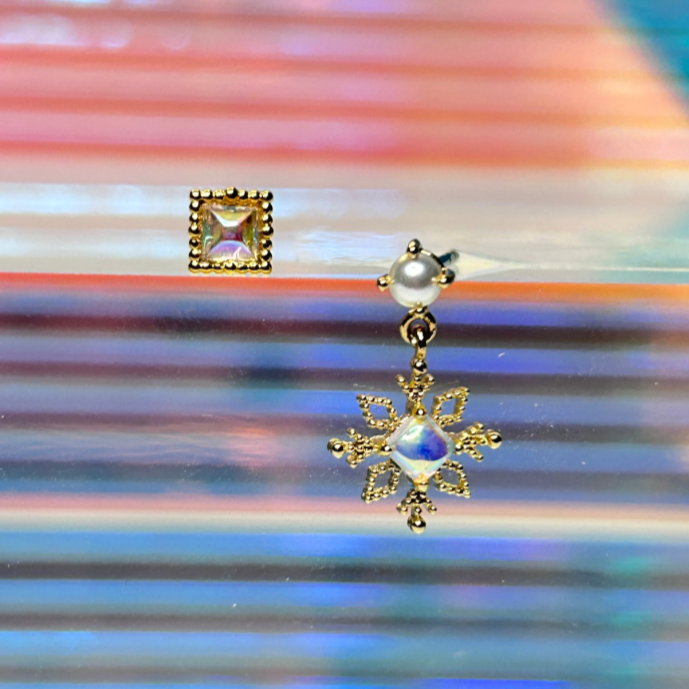 The earring post crafted from surgical steel, the mismatched design features subtle pearlescent embellishments for subtle sparkle. The perfect addition to any outfit, these earrings will quickly become your favorite accessory.