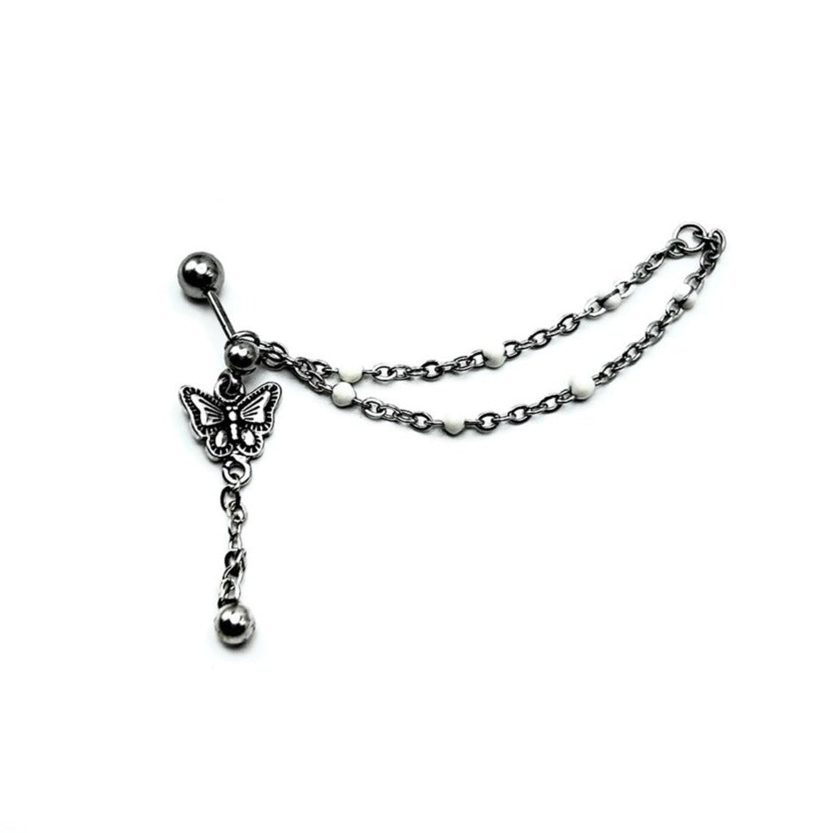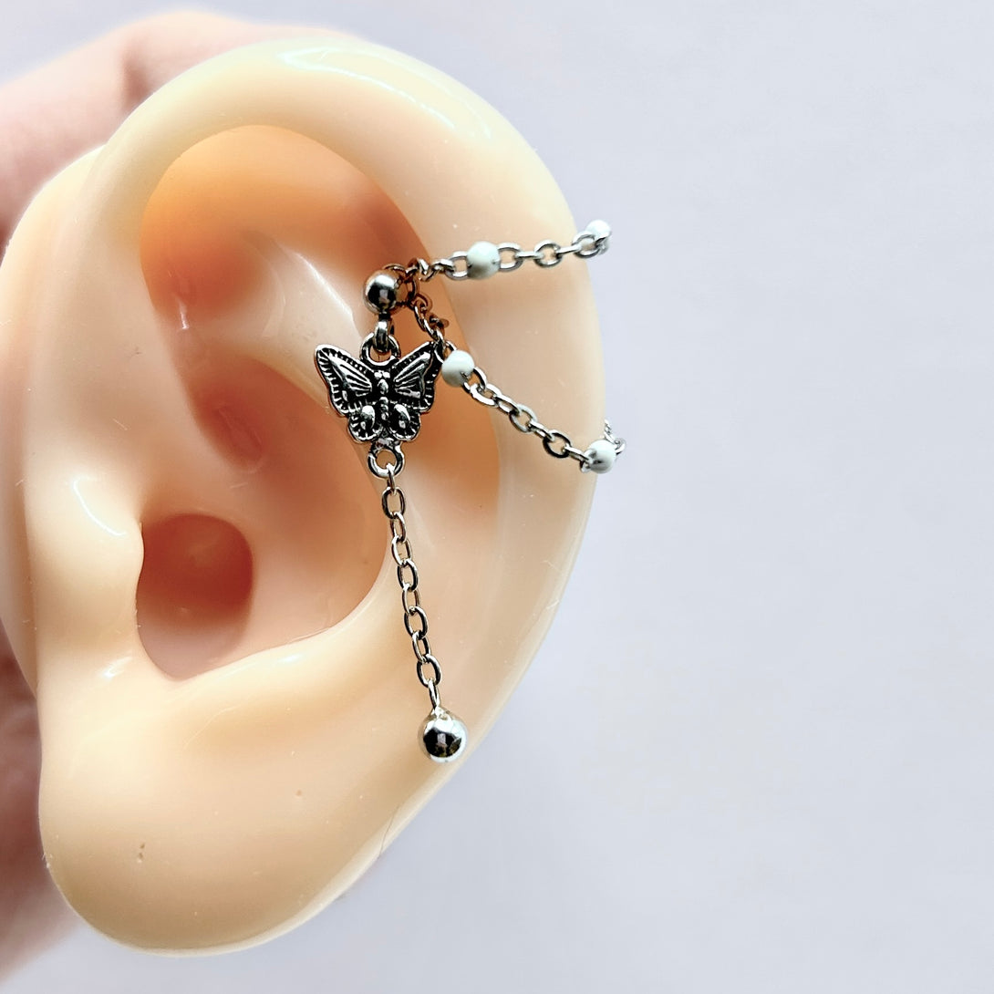 Vintage Butterfly Drop Cartilage Barbell Stud With Beaded Double Layer Chain